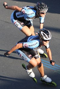 Heiße Rollen: am Vortag maßen die InlinerInnen ihre Kräfte. Favoritin Caecilia Baena (vorne) setzte sich im Zielspurt durch.