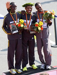 Sieger Haile Gebrselassie mit dem Zweiten Francis Kiprop (links) und dem Dritten Terfa Negari, die sich über ihre persönliche Bestzeiten freuen konnten.
