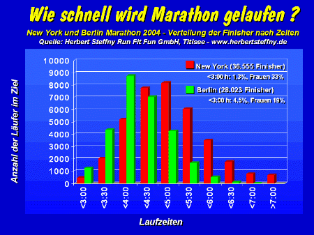 Der Vergleich des Frankfurt Marathons 1985 mit dem Berlin Marathon 2004 zeigt einige Unterschiede in der Entwicklung der letzten 20 Jahre auf. Bei 7.296 Finishern kamen 1985 in Frankfurt 1.735 Läufer unter 3:00 Stunden ins Ziel. Das sind fast 24 Prozent aller Läufer! Bei 28.023 Finishern, also fast viermal soviel Läufern, schafften das in Berlin nur noch 1.257 Teilnehmer. Das sind gerade mal 4,5 Prozent. Auch der Weltrekord des Kenianers Paul Tergat in 2:04:55 auf der schnellen Berliner Strecke kann nicht darüber hinweg täuschen, dass die Leistungsdichte auch bei den ambitionierten Freizeitläufern deutlich zurückgegangen ist. Unter 2:30 Stunden liefen 1985 in Frankfurt 146 in Berlin 2004 nur noch 71 Läufer. Das sind trotz des Riesenteilnehmerfeldes weniger als halb so viele und prozentual mit 2,2 gegen 0,25 Prozent der Gesamtläuferzahl sogar fast 10mal weniger! Die gesamtdeutschen Statistiken verzeichneten 1985 bei den Männern im Spitzenbereich 48 Zeiten unter 2:20 Stunden einen Rekordstand. Sie wurden von 34 Läufern erzielt. Im Jahre 2004 schafften das gerade mal noch 5 Läufer! Das entspricht einem Rückfall auf den Stand der 60er Jahre! Das Gute daran: schlechter kann es eigentlich nicht mehr werden....