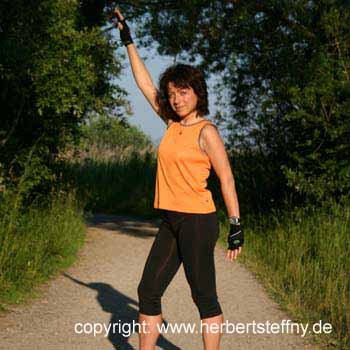 ArmkreisenLegen Sie den Stock zur Seite. Nun kreisen Sie mit gestreckten Armen vorwärts und rückwärts. Schwierigere Variation: versuchen Sie doch mal die Arme vor- und rückwärts gegeneinander zu schwingen. Ein Arm fällt nach unten, während der andere nach oben schwingt. Das ist gleichzeitig eine gute Koordinationsübung und Gelegenhiet zum Erlernen neuer Bewegungsgmuster. Nicht gleich verzweifeln, Sie werden es mit einiger Übung bestimmt hinbekommen. |