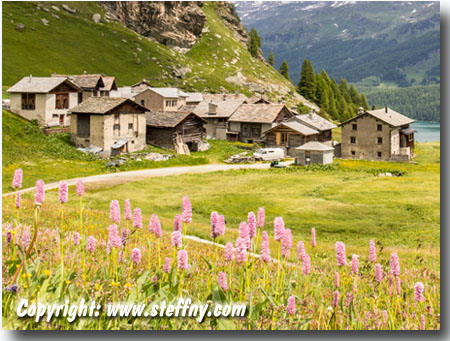 Trollblumenwiese am Wegesrand nach Blaunca | Auf dem Weg nach Blaunca passieren wir das Heididorf Grevasalvas | Programm | Experten | Seminarinhalte